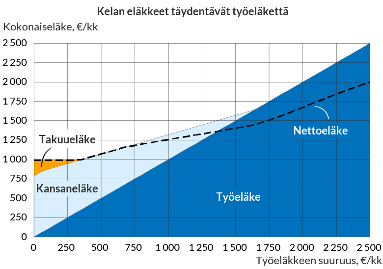 Kansaneläke pienenee työeläkkeen kasvaessa. Kun työeläke saavuttaa tietyn tason, kansaneläkettä ei myönnetä enää lainkaan.