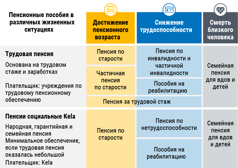 Трудовая пенсия зарабатывается за счет собственной оплачиваемой заработной платой работы или предпринимательской деятельности. Если вы проживаете в Финляндии и ваша трудовая пенсия невелика, ее можно дополнить народной пенсией и гарантированной пенсией, выплачиваемыми системой Kela.